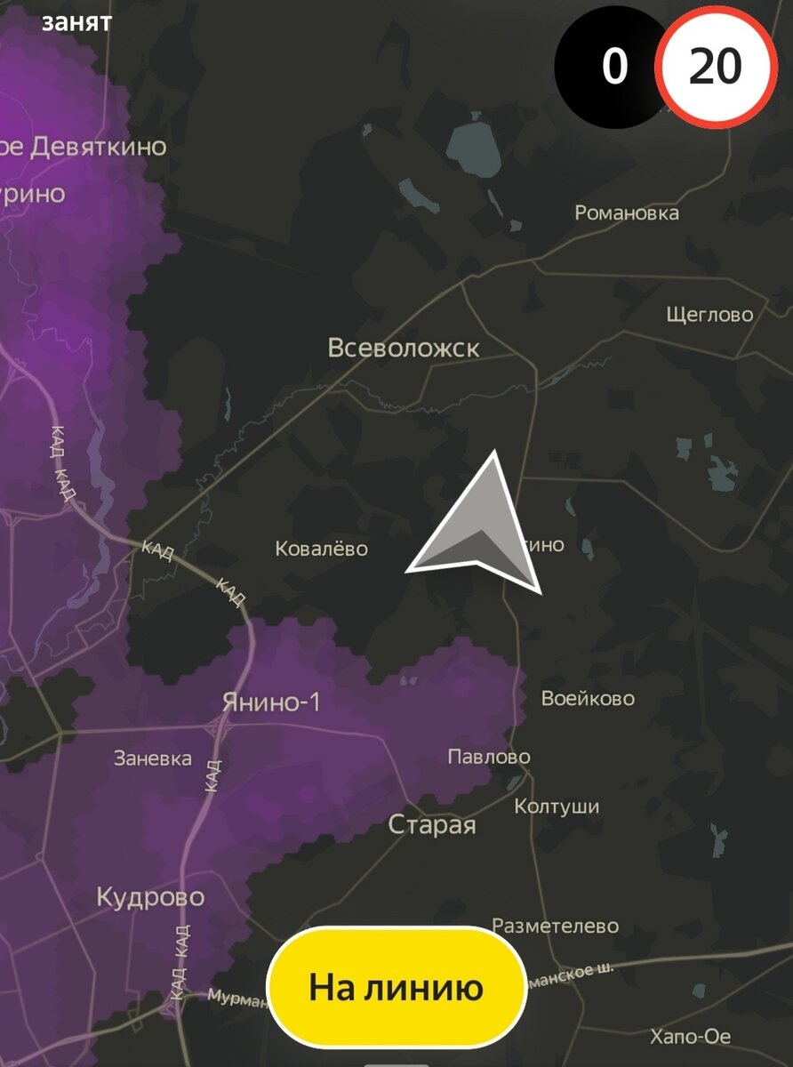 Всеволожск это преимущественно зелёнка, с минимальной стоимостью поездки в Экономе 59 рублей. Территория красится фиолетовым редко, в часы пик, и то на короткий срок: