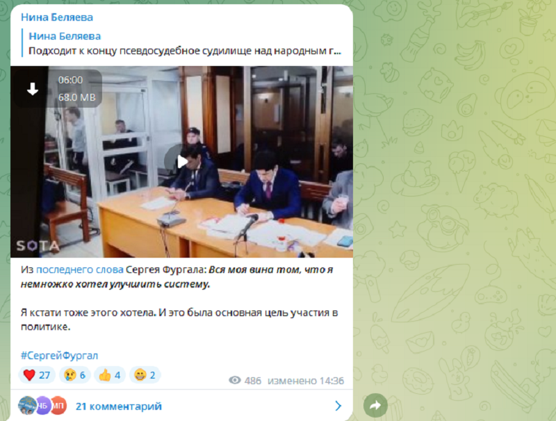Беглая экс-депутатка райсовета Нина Беляева, внесённая в августе 2022 года в список экстремистов и разыскиваемая семилукской полицией, вовсю топит в Сети за Сергея Фургала. Даже сравнивает себя с бывшим губернатором Хабаровского края, которого сейчас приговорили к 22 годам колонии строгого режима по делу об организации двух убийств и покушения, совершённых в начале 2000-х. По версии следствия, в 2004–2005 годах Сергей Фургал организовал покушение на бизнесмена Александра Смольского и убийство предпринимателей Евгения Зори и Олега Булатова, которые, как утверждает СКР, мешали вести бизнес будущему губернатору. Скрывающаяся в Латвии Нина Беляева с 8 февраля развернула в своём телеграм-канале кампанию в защиту Фургала, опубликовав с десяток пафосных постов с хэштегом #СергейФургал. Апофеозом стало сравнение себя с бывшим губернатором. Под очередным видео из зала суда Нина Беляева написала: «Из последнего слова Сергея Фургала: Вся моя вина том, что я немножко хотел улучшить систему. Я, кст
