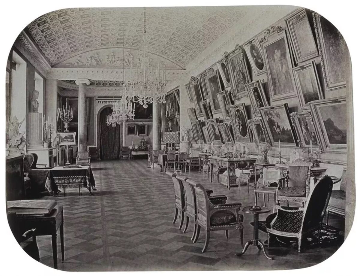 Другие полотна – на большой стене. Зная размеры сохранившихся картин, мы получаем приблизительную длину этой стены примерно в 5,5 метров. Именно этот отрезок затем оказался модулем, то есть равен центральной части – между каминами – основного помещения будущей Картинной галереи (от колонн до колонн) в Петербурге, при том, что вся длина петербургского зала 28 метров, то есть в пять раз больше. Сумма длины двух фрагментов торцовых стен (с картинами) и большой парижской комнаты примерно 14 метров, то есть идентична протяжённости всей основной части интерьера Воронихина.
