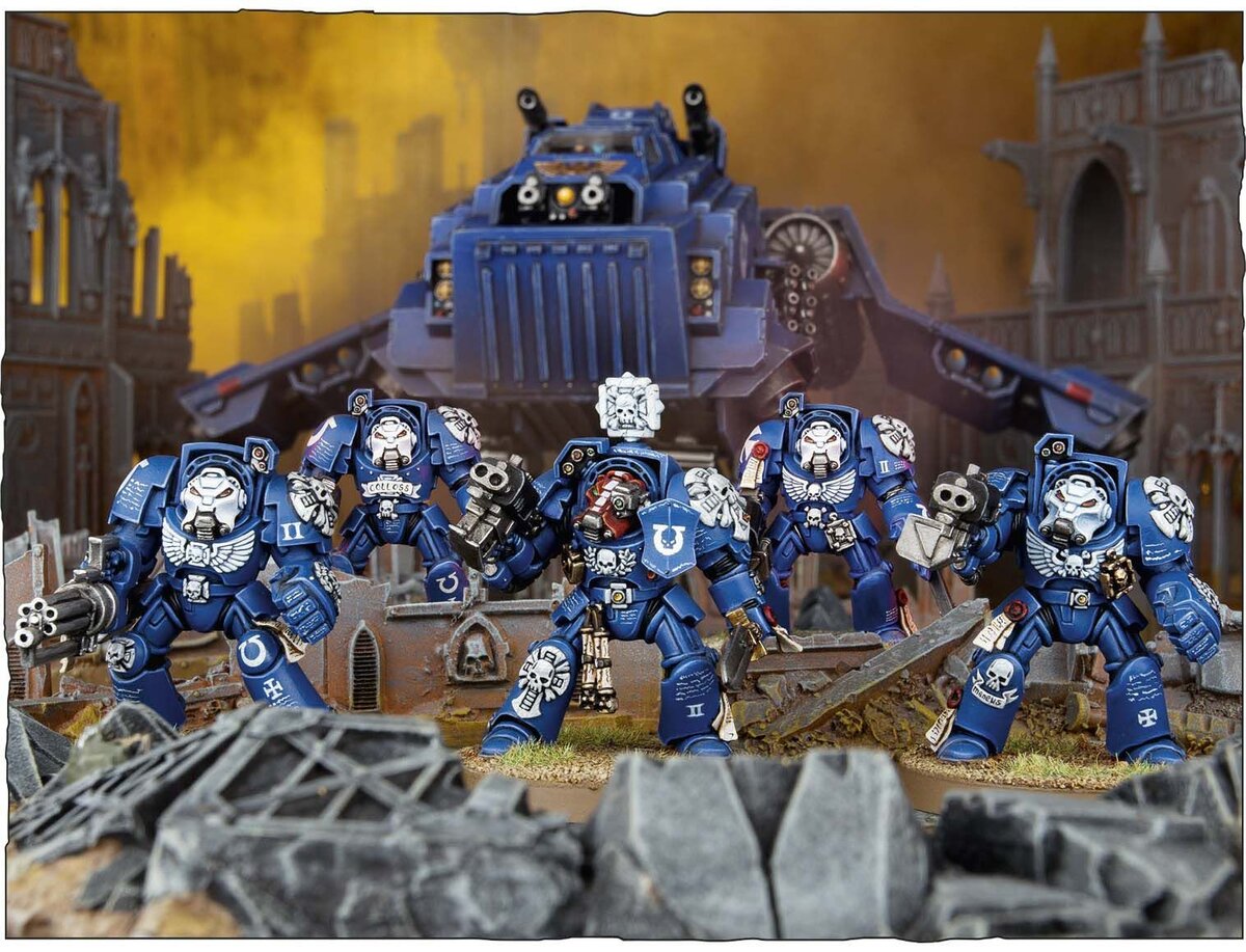 Уже совсем скоро выедет новая 10-ая редакция правил Warhammer 40 000, и мне хотелось бы вспомнить про один из знаковых юнитов для нашего варгейма, который, наверное, на ряду с дредноутом "Кастраферрум" является лицом Warhammer'а. Речь, конечно же о терминаторам. Впервые с терминаторами как с юнитом я познакомился при игре в Dawn of War, а как с миниатюрой - при покупке стартера "Темная Месть" 7-ой редакции. На тот момент 5-ка этих парней казалась мне чем-то нереально детализированным и нечеловечески пафосным. Предыдущую их итерацию из стартера 5-ой редакции "Битва за Черный Предел" я увидел вживую гораздо позже. И, как думаю, вы согласитесь, прогресс в скульпте на лицо. На момент 7-ой редакции это был довольно интересный юнит из-за своей 2-ой брони. Если кто-то не знает, то раньше показать "АР" работал иначе, и терминаторы очень редко не могли кидать свой спас-бросок за броню. Юнит был очень живучий. Кроме того, силовые кулаки били больно, а стрелковое вооружение могло неплохо проред