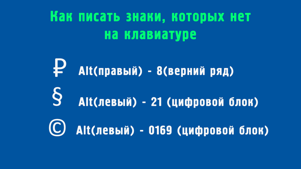 Наиболее часто встречаемые символы можно увидеть на клавишах своей клавиатуры, но бывают случаи, когда нам необходимо использовать знак рубля ₽ или цитаты ©. В таком случае мы должны знать комбинации клавиш, которые помогут быстро вводить данные символы.
