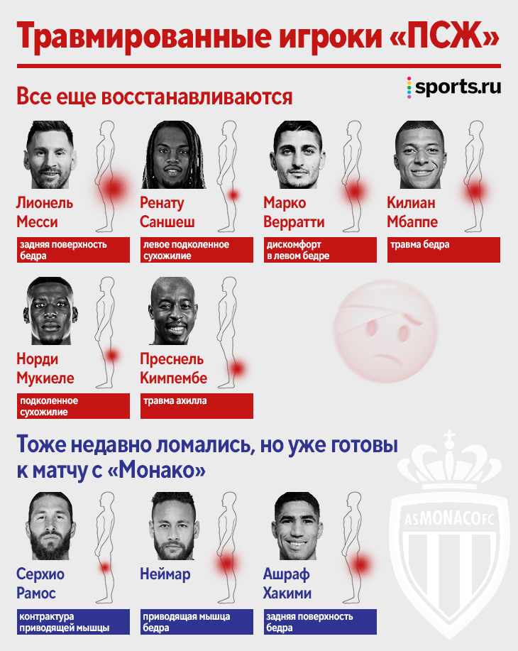 А вот Месси уже восстановится. На днях «ПСЖ» не только вылетел из Кубка Франции (1:2 с «Марселем»), но и потерял Лео Месси – он повредил заднюю поверхность бедра. Это продолжение жуткой эпидемии травм, которая обрушилась на «Париж» – вот ее главные элементы. Травмы накрыли «Париж» совсем не вовремя: 14 февраля команду ждет первый матч с «Баварией» в 1/8 финала Лиги чемпионов. Но не все так ужасно: Месси к ЛЧ восстановится, Неймар и Рамос уже играют Раскроем каждый случай отдельно. ❌ Месси точно пропустит игру с «Монако» (11 февраля), но сыграет с «Баварией». Лео вернется к тренировкам в понедельник, за день до матча Лиги чемпионов. Главный тренер «ПСЖ» Кристоф Гальтье уже подтвердил. ❌ Килиан Мбаппе повредил левое бедро в матче Лиги 1 с «Монпелье» (3:1) и выбыл на три недели. Судя по таким срокам, нападающий не сыграет с «Баварией», хотя он прикладывает максимум сил для скорейшего возвращения. ❌ У Ренату Саншеша тоже проблемы с бедром, его заменили уже на 14-й минуте игры с «Тулузой».