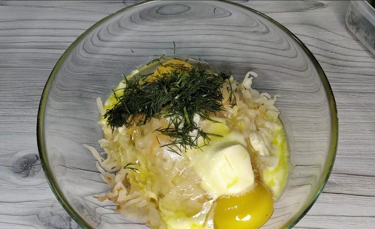 Доброго времени суток, читатель! Впервые увидев этот рецепт, я удивилась, но решила попробовать. Мой муж капусту любит в любом виде. Пирог получился очень вкусным и сытным. А приготовить его очень просто. Для приготовления нам понадобится: 1. С капусты сливаем рассол. Если слишком сочная, надо немного отжать. 2. Добавляем к капусте яйца, размягченное или растопленное сливочное масло, сахар и мелко порубленную зелень (у меня замороженная). Всё тщательно перемешиваем. Свежую зелень можно заменить сушеной. 3. Просеиваем муку, добавляем к остальным ингредиентам и хорошо вымешиваем. Если тесто получается слишком густым, можно добавить немного рассола от капусты. Соль в тесто не добавляем, её достаточно в капусте. 4. Форму для выпечки смазываем маслом и посыпаем манкой, чтобы пирог не прилип. 5. Выкладываем тесто, разравниваем и отправляем в духовку на 35 – 40 минут при температуре 180 градусов. 6. Вынимаем из духовки, немного остужаем и достаем из формы. Нарезаем и едим с удовольствием! Ес