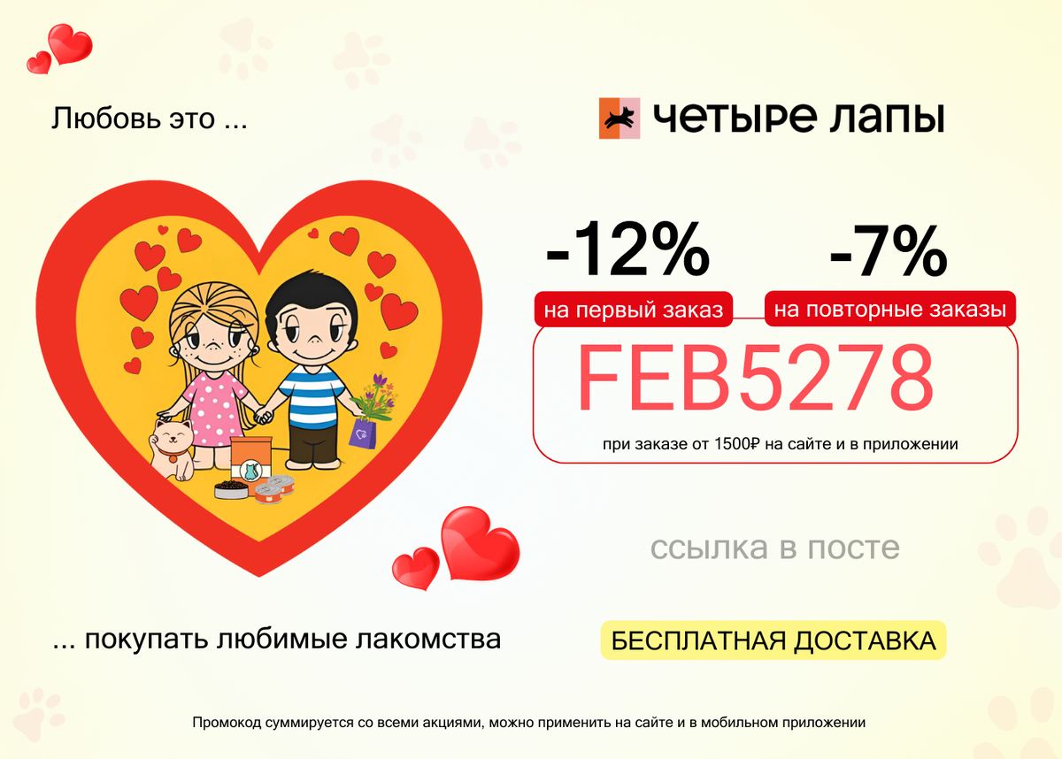 Наверное, каждый задавался этим вопросом, когда в семье появился новый житель и как было бы круто на этом этапе получить рекомендацию специалистов. Зоомагазин Четыре Лапы решил это и представляет своим покупателям целых два раздела, один из них - "Телеветеринария", онлайн-консультация со специалистом, который ответит на все ваши вопросы по уходу за питомцем. Второй раздел - "Завели котенка", в котором собраны все товары для котят, там можно купить все от корма до лекарств. А для того, чтобы покупки в магазине Четыре Лапы были не только полезными, но и выгодными, у меня для вас есть промокод FEB5278, который даст вам скидку 12% на первый заказ и 7% на ВСЕ повторные заказы. Промокод суммируется со всеми акциями и именно так каждая ваша покупка будет выгодной. Переходите по ссылке https://4lapy.prfl.me/miagkie_lapki/6ceb2529dcdf, совершайте покупки с использованием промокода и порадуйте своего любимца.