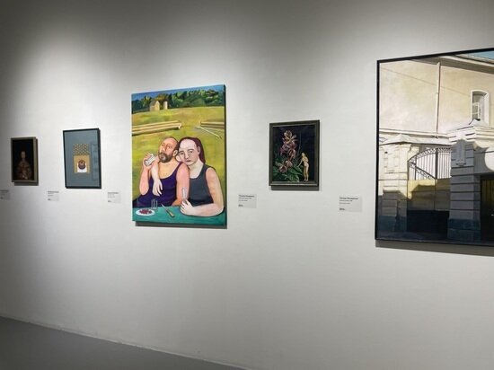 Среди дверей-порталов есть и работы другого содержания, которые разыгрывают свой сюжет на фоне этих декораций. На самом видном месте картина Татьяны Назаренко «Деревенские радости». Перед нами мужчина и женщина с опустошенными лицами и рюмками. В образах этих людей нет радости, зато между ними есть близость, спасающая от окружающей тоски.