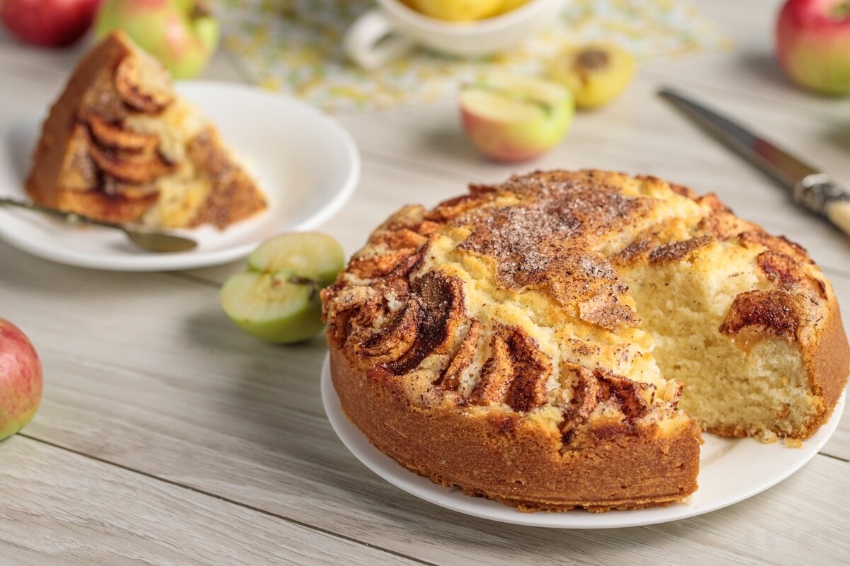 Наивкуснейший, нежный, ароматный, мягкий, воздушный! Заливной пирог на ряженке с яблоками запекается в духовке очень быстро. Это необыкновенно вкусный, пышный бисквит с ярко выраженным вкусом ряженки. За счет нее у теста более плотная структура, что делает выпечку интереснее Шаг 1: Подготовьте ингредиенты по списку. Ряженку можно взять любую, у меня 4% жирности. Яблоки также выбирайте по своему вкусу, я взяла кисло-сладкие. Их сладость вы можете корректировать сахаром, добавляя или убавляя его количество в составе. Вместо сахара можете использовать мед или сахарозаменитель. Ряженку заранее выньте из холодильника, она должна быть комнатной температуры. Шаг 2: Яйца взбейте с сахаром в пышную пену в отдельной глубокой миске. Лучше делать это миксером. Шаг 3: Влейте во взбитые яйца ряженку. Еще раз взбейте полученную массу так, чтобы она стала однородной. На этот раз можете использовать обычный венчик. Шаг 4: Муку просейте с разрыхлителем и частями добавляйте в тесто. Учтите, что муки у ва