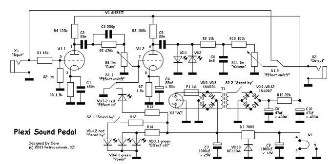 Друзья, в рамках рубрики «Архив» представляю вашему вниманию статью моего друга и соратника – Александра Лопата, датируемую 2003-м годом. Все необходимые разрешения – получены, авторские орфография и пунктуация - соблюдены:-). Представляю Вашему вниманию педальку со звуком J.Hendrix-а, A.Young-а, R. Blackmore-а - звуком первых усилителей Marshall, легендарных Plexi (JTM45, 1959 и.т.д). Она предназначена для подключения к ламповому усилителю в качестве грелки. Наилучший звук у этой примочки получается при небольшом подгрузе оконечного каскада усилителя. В примочке применен отлично звучащий двойной триод 6Н23П (странно, почему их практически не используют в гитарном оборудовании?). Причем лампа только усиливает звук, практически не искажая (только при сильной атаке). Так сказать «утепляет» звук, придает ему «ламповую» окраску. Ограничение сигнала осуществляется светодиодами, включенными на выходе второго каскада. Для устранения «песка» и «треска» после ограничителя находится пассивн