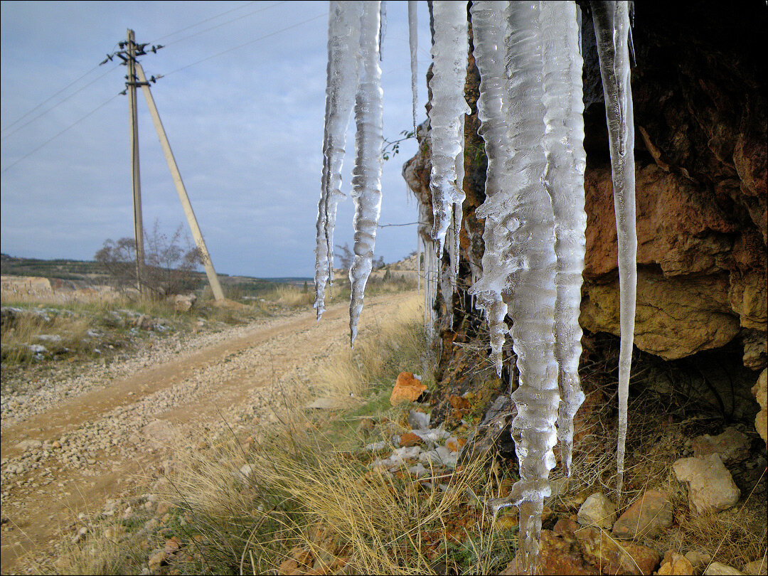 Небо вдали обнадеживающе синеет — но над морем по-прежнему тучи. Только что мы начали наш путь от Балаклавы вверх. Цель — гора Аскети, а пока мы тормозим на Кефало-Вриси. Даже в такую погоду трудно оторваться от панорамы Балаклавской бухты, да ещё украшенной кипарисами, тёмными свечками растущими между жёлтых камней, служивших строительным материалом ползущих вниз подпорных стен. Влекомые серпантином, мы всё-таки поворачиваемся к пейзажу спиной, а там сюрприз. Роскошный сюрприз! Изгиб серпантина врезается в камень скалы глубоким туннелем. И по каменной стене — коричневой и охристо-жёлтой — струятся ледяные каскады. Целый водопад сосулек, хрустальный замок из сверкающих сталактитов, сталагмитов, переливающихся колонн и ледяных причудливых зеркал. В обрамлении бесснежных по-летнему склонов, зелёной травы и голубого неба. По сосулькам стекает вода, срываясь вниз самоцветными каплями. Прорвавшееся наконец сквозь облачность солнце зажигает ледяное великолепие совсем уж невозможным сиянием.