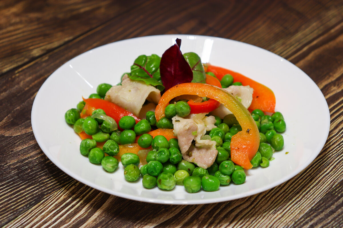 5. К овощам и бекону добавить горох. Посыпать орегано, посолить и поперчить. Готовить ещё 3-4 минуты.