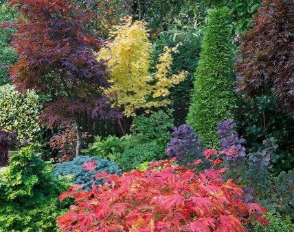 Весной покрыт массой желтых цветов, за которыми быстро следует ярко-красная молодая листва. Глубоко разделенные листья летом становятся малиновыми, а осенью приобретают последний оттенок алого цвета.