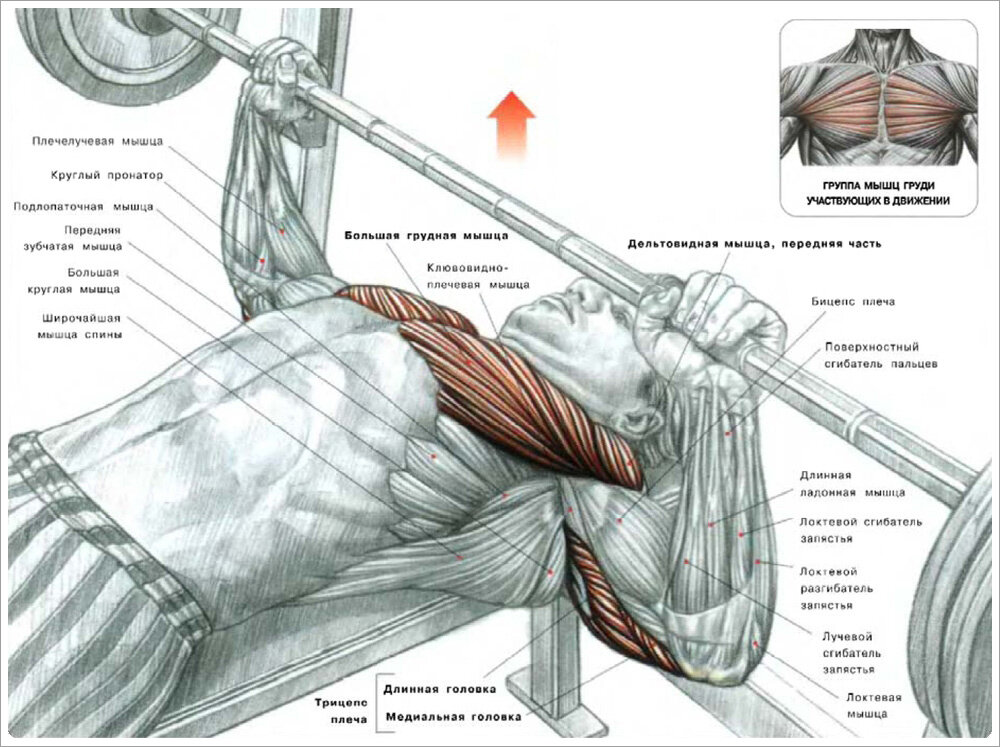Основное предназначение — развитие мышц груди. Но в работу включаются не только они. Перечислим основные мышечные группы, которые позволяют выжимать вес: