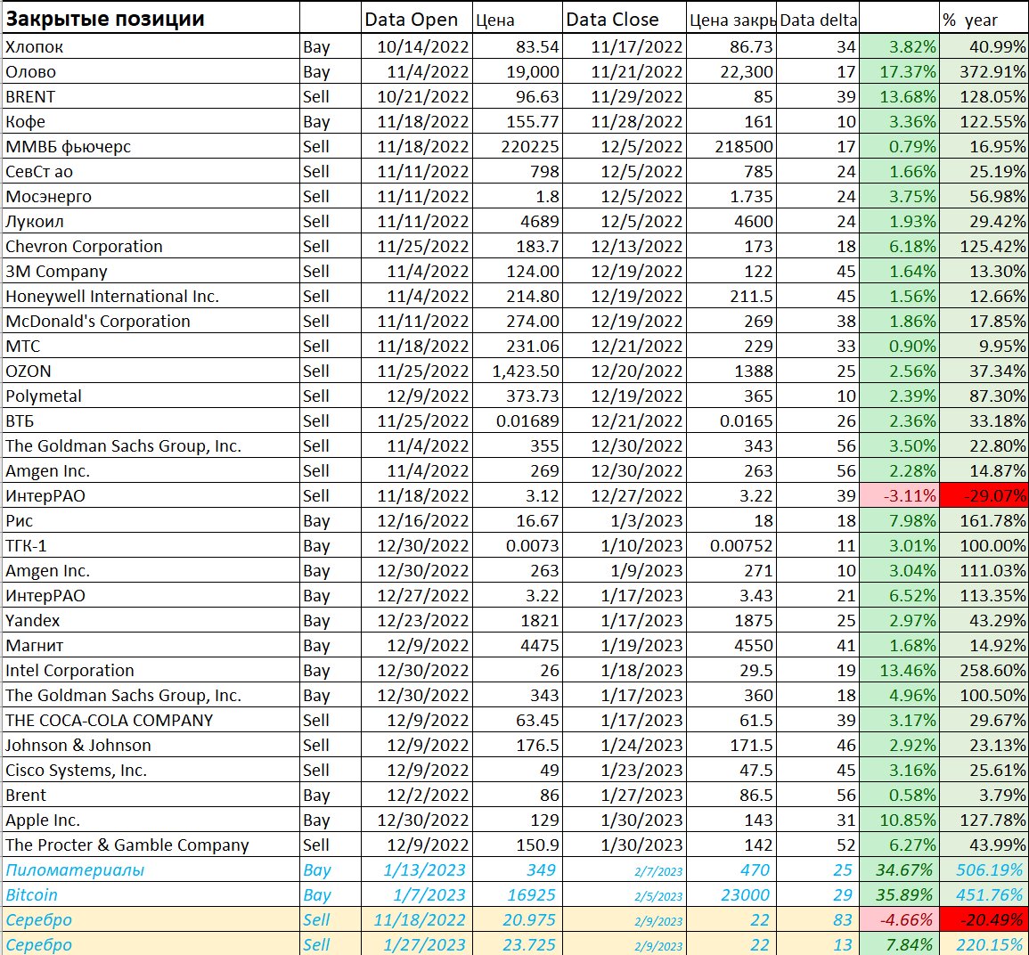 11/02/2023 Товарный рынок и рынок криптовалют Товарный рынок на этой неделе наконец то стал немного радовать. Во-первых, по тейку закрылись Bitcoi/USD и пиломатериалы показав очень приличный результат. А что самое приятное закрылась позиция по Серебру, первая из трех тяжелых позиции на этом рынке. Точнее закрылись две позиции по этому активу, одна в минус, а вторая в плюс, но суммарно результат положительный, хотя для статистической обработки результатов системы в таблице оставим эти позиции как две. По активу Олово цена не дошла до рекомендованной совсем немного, так что посмотрим, что будет в начале след недели и в крайнем случае эту парную позицию закроем в ноль. А по Золоту пока посмотрим, как будут изменяться цены, скорее всего и по данному активу получиться парную позицию закрыть с итоговым плюсом. Динамика цен по активам Алюминий и Пшеница позволяет выставить тейки на следующую неделю по Алюминию на уровне 2500 по Пшеницы 780. Что касается Платины тут рекомендация простая, как