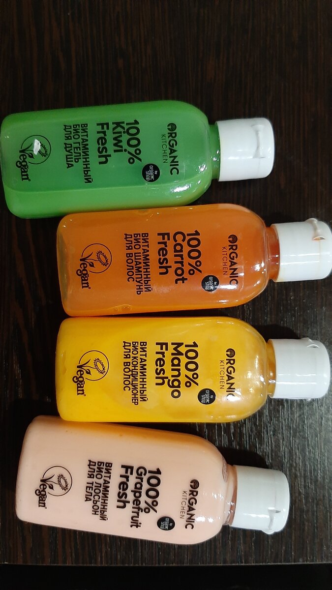 Всем привет с вами Наталья) Решила поделиться с вами недавней покупкой. Для видео распаковки купила несколько подарочных наборов с косметикой ( видео смотрите ) Сегодня решила написать мое мнение про набор для тела от organic kitchen. В набор входит гель для душа киви, лосьон для тела грейфрукт, шампунь морковный, кондицонер для волос манго. К сожалению выкинула упаковку, была яркая, привлекательная. Это тревел формат удобен для поездок, занимают мало места. Объем бутылочек 50мл. Вот так смотриться набор. Начала сначало тестить шампунь и кондиционер, шампунь очень жидкий на волосах плохо распредиляется, запах совсем не морковный. Намыливала голову 2 раза, но результат не порадовал. Кондиционер такой же жидкий, но аромат манго более менее имеется в отдушке. После кондиционера волосы стали значительно мягче. После высушивания феном, волосы стали пушистые и электризовались. После мытья головы свежесть держалась 2 дня. Ну для моей структуры это нормальный результат. Гель для душа кив