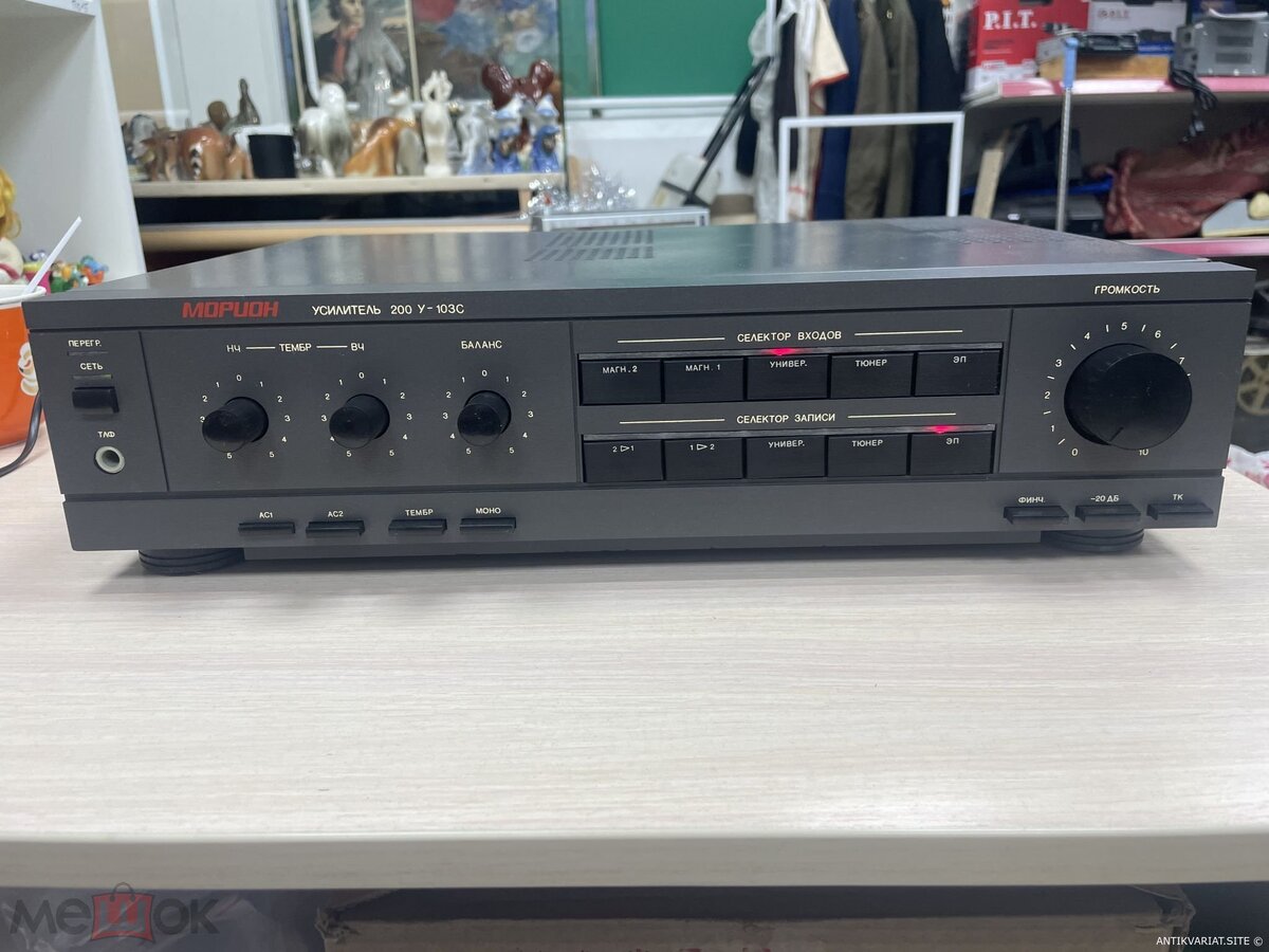 Усилитель полный Морион 200У-103 Стерео. Изготовитель этого чуда - Пермский завод аппаратуры дальней связи. Выпускался с 1994 года, и по-моему в том же году и сняли с производства. В свое время являлся одним из лучших усилителей первого класса, и мог с лёгкостью конкурировать с импортными усилителями. Да и сейчас на него есть огромный спрос, а предложений на торговых площадках мало, особенно в хорошем и обслуженном состоянии. Характеристики усилителя Морион 200У-103 Стерео: Диапазон воспроизводимых частот: 20 – 25000 Гц Номинальная выходная мощность одного канала: 100 Вт при 8 Ом Долговременная мощность: 200 Вт Кратковременная мощность: 230 Вт Коэффициент нелинейных искажений: 0,025% Отношение сигнал/шум: 80 дБ Максимальная потребляемая мощность от сети: 400 Вт Габариты усилителя (ШхВхГ): 430×110х362 мм Масса: 12 кг Усилитель обеспечивает: 1. Регулировку уровня громкости в 2-х каналах одновременно; 2. Ступенчатое уменьшение уровня громкости на 20 дБ от установленного уровня громко
