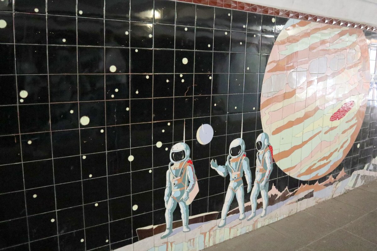 Продолжу про подземные переходы Ростова в центре. Повторюсь, между Садовой улицей и Ворошиловским проспектом предоставлена тема жизненного пути от детства до юности, эти ни панно я показала в прошлый раз. А теперь "взрослая составляющая" - профессии. Естественно, на фото представлены не все, но посмотреть очень любопытно, как же их видели в СССР? 🤔 Ещё один мозаичный переход между Садовой улицей и Кировским проспектом. Здесь расскрыта тема космоса. Честно, мы лично видели только эти два,но если заинтересовались, есть ещё два: переход между Садовой и Буденновским проспектом (тема Великой Отечественной 1941-1945 годов и Азовские походы Петра l), улицы Московской и Буденновским проспектом (фауна и флора Ростовской области). А Вы знали об этой достопримечательности Ростова, пришедшей к нам из СССР?