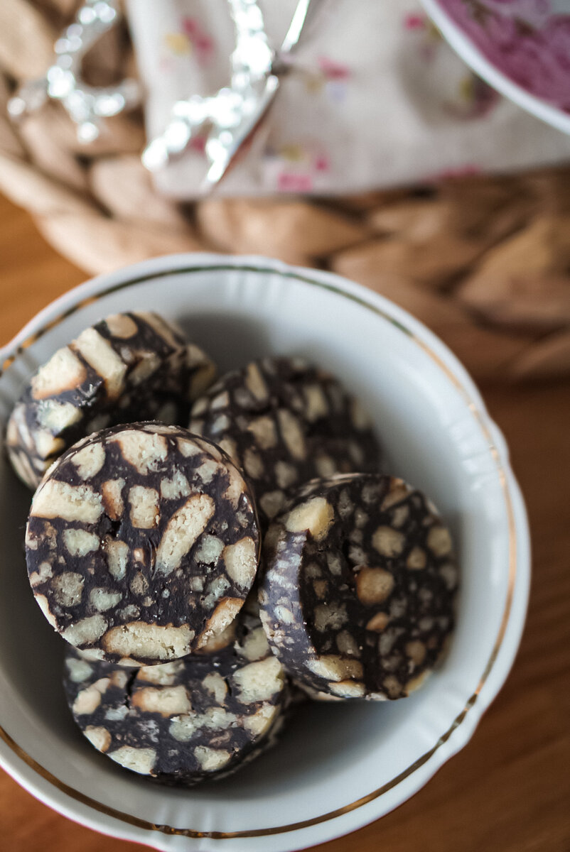 Каждый день в ресторане я готовлю сложные десерты с использованием современной техники и ингредиентами, которых не найти в обычном магазине. Но дома мне хочется готовить что-то простое и быстрое. Мои друзья тоже просят принести на наши домашние вечеринки, что-то такое из детства. Пожалуй, мой самый любимый десерт с ароматом ностальгии - это шоколадная колбаса, мама нам такую делала очень часто. Я конечно добавила немного современности, что отразилось на вкусе только в лучшую сторону. Итак, нам понадобиться: 500 грамм самого просто печенья 150 грамм сливочного масла 100 грамм молоко 100 грамм шоколад 54% 30 грамм сахар 20 грамм какао 30 грамм орехов по желанию (пекан или фисташки) Печенье нужно порубить на сегменты среднего размера. Если есть орехи - тоже порубить, я люблю добавлять пекан. Вкусно будет и с фундуком и с фисташками, грецкие орехи не люблю. В сотейник (кастрюльку небольшого размера) сложить масло, молоко, шоколад, какао и сахар. Довести до кипения и немного провар