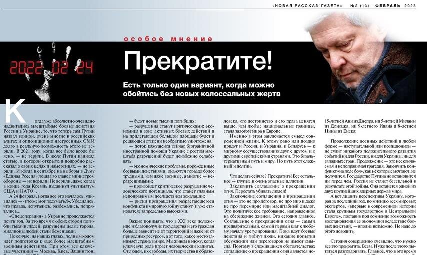 Тезисы из статьи Григория Явлинского «Прекратите!»: 24 февраля, когда все это началось, удивились — «кто же мог подумать?!». «Спецоперация» в Украине продолжается почти год. За это время с обеих сторон погибли тысячи людей, разрушены целые города, миллионы людей стали беженцами. Но сейчас, на наших глазах, полным ходом идет подготовка к еще более масштабным военным действиям. «Мыслители»-мечтатели из пока безопасного далека призывают непременно продолжать военные действия до победного конца, рассказывают на страницах известных журналов о «прекрасной парламентской России будущего» и «показательных судебных процессах». «Аналитики» умно и холодно уточняют, что на мир пока запроса нет… И снова, как год назад, почти никто не понимает — или боится произнести вслух, — что опасности очень серьезно нарастают и что у происходящего, то есть у продолжения военных действий, в принципе нет положительной перспективы. Никакой! Если все это продолжать: · будут новые тысячи погибших; · разрушения стану