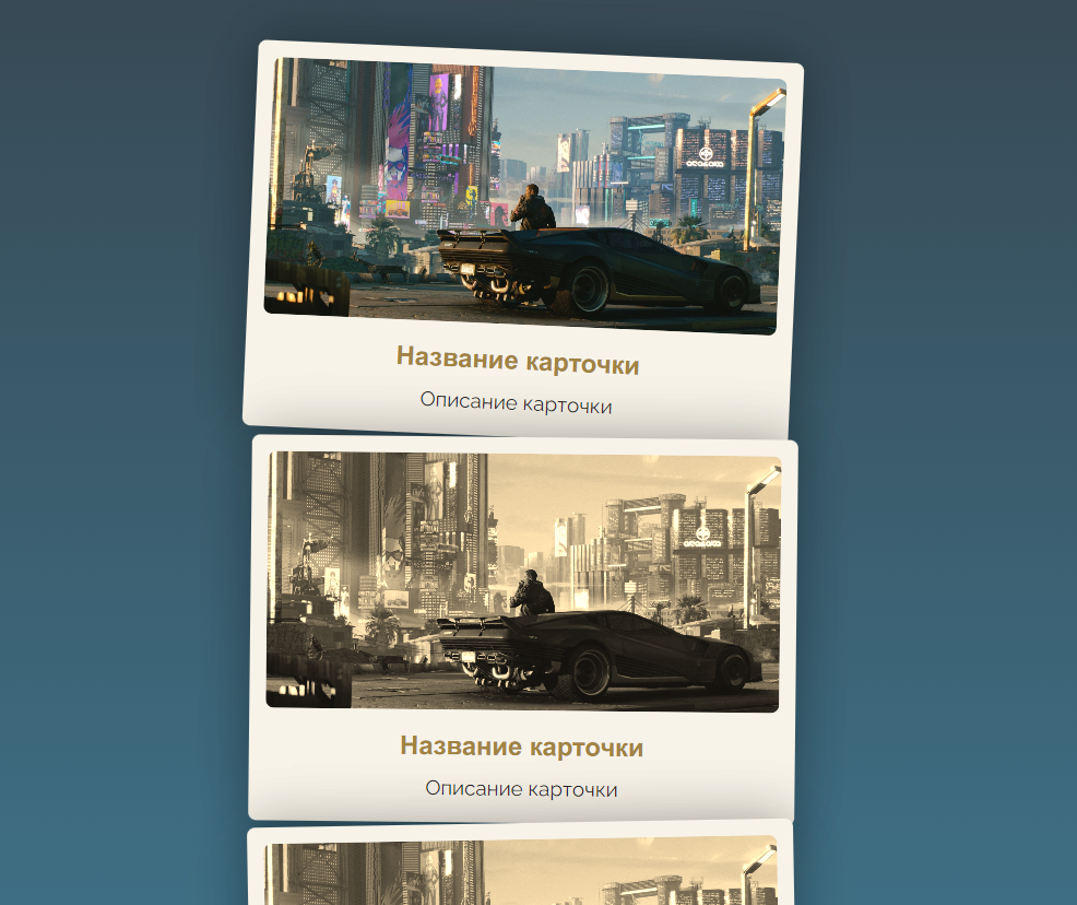 При наведении курсора появляется настоящий цветовой эффект картинки, на фото видно. Как добавить карточку Сам код: <div class="stcard-container">