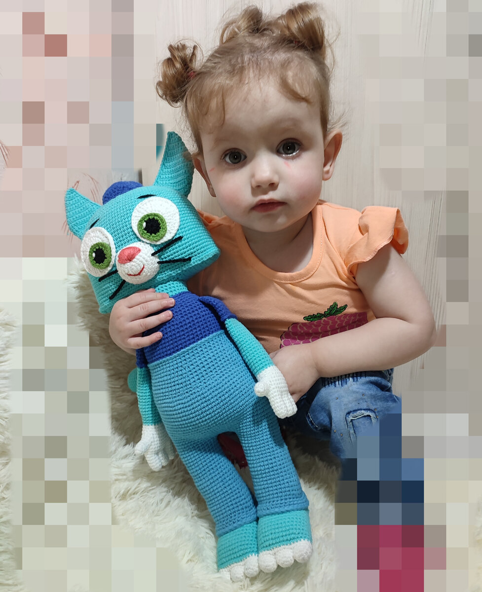Не умею я видимо вязать по картинке маленькие игрушки. Мой котик получился 40 см без учёта ушек.
