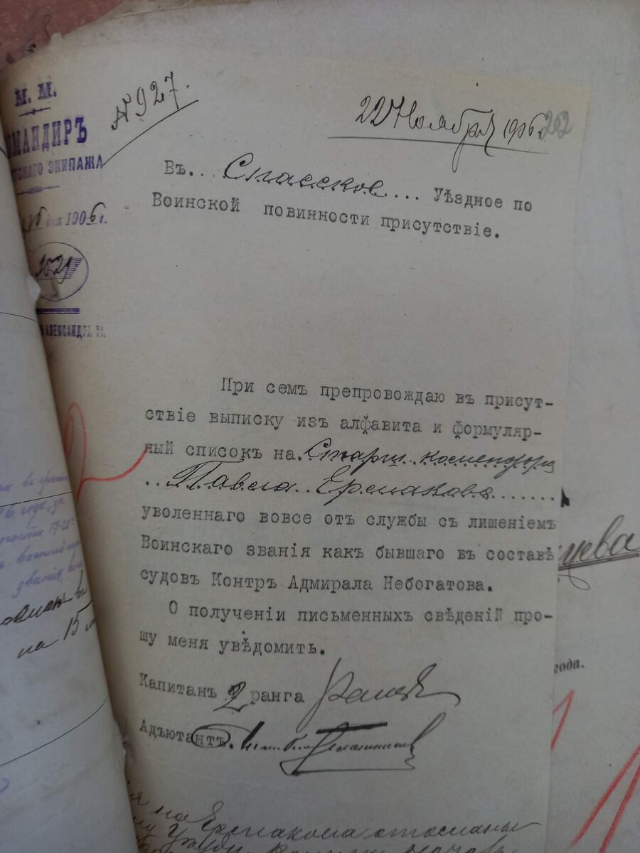 22 августа 1905 года контр-адмирал Н. И. Небогатов за сдачу в плен японцам во время Цусимского сражения 14-15 мая эскадренных броненосцев «Император Николай I», «Орёл» и броненосцев береговой обороны «Генерал-Адмирал Апраксин» и «Адмирал Сенявин», был «исключен из службы с лишением чинов и последствиями, означенными в статьях № 36 и 38 Военно-морского устава о наказаниях».