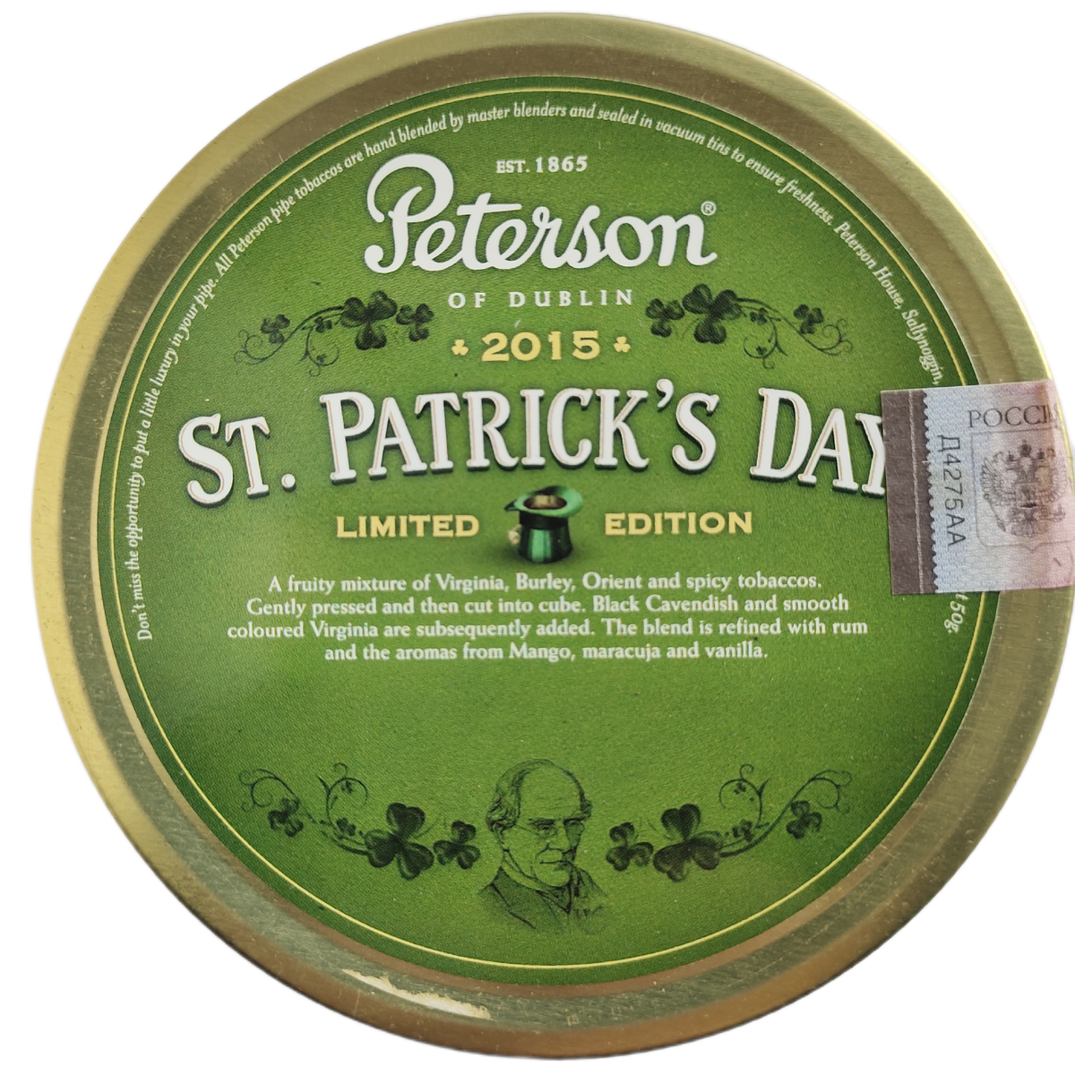 Крепость /4 из 10/ ниже средней Производитель: Kohlhase, Kopp and Co. DE Состав: Black Cavendish, Burley, Oriental, Virginia Ароматизация: Алкоголь, фрукты, ваниль Нарезка: Coarse Cut "Табак для трубки Peterson of Dublin 2015 Limited Edition 2015 St. Patrick`s Day – это великолепная смесь нескольких сортов Вирджинии, Берли и пряных, пикантных Ориенталов. После смешивания в табак добавляется выдержанный под прессом и нарезанный кубиками Темный Кавендиш, наполняющий вкус смеси ароматами рома, ванили и экзотических фруктов." (описание производителя) Табачнотрубочная компания Peterson 2015 отмечала юбилей, 150 лет. К празднику приготовили несколько лимитированных табаков, среди них St.Patrick's Day. В 2016 ирландцы отдохнули, выпустив, в дальнейшем, Санпатрики 2017 и 2018. В 2018 эпопея с трубочными табаками Peterson завершилась, марку и рецепты передали датской STG, которая извела линейку и начала под лейблом Peterson выпускать табаки, ранее принадлежащие Данхиллу. Я понимаю, денежки дене