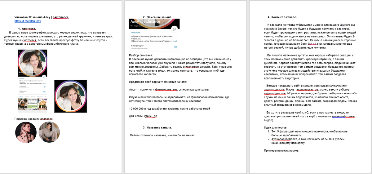 3. Начинающие психологи (те, кто консультирует недавно, мало клиентов, низкий чек за услуги). Процесс работы: 1) Рекомендации по упаковке канала и обсуждение рекламных подач Перед началом продвижения всем своим клиентам даю реком