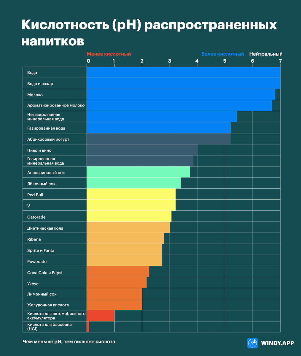 Кислоты – это вещества с pH ниже 7. Нейтральный pH, то есть равный 7, можно найти только у абсолютно чистой воды, состоящей исключительно из молекул H2O. Чем меньше pH, тем выше кислотность. Кока-кола, например, обладает pH в 3, а близкую к нулю pH в естественных условиях можно найти разве что в геотермальных водах у действующих вулканов.