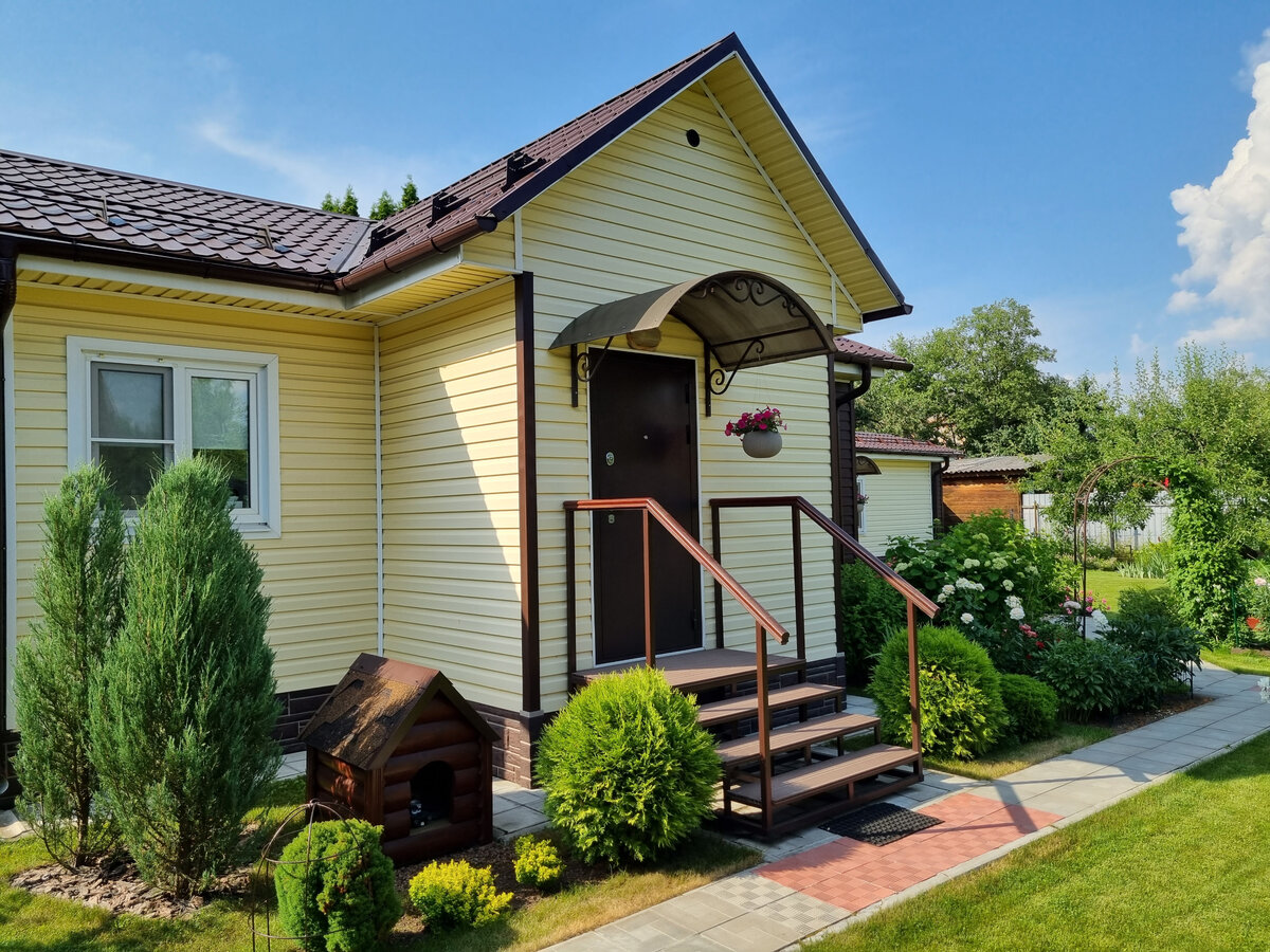 На участке расположен дом, баня, домик для инструментов, навес для автомобиля и дровник. Проложена сеть дорожек. Особенно это важно в межсезонье. Ведь хождение по размокшей земле никому не доставляет удовольствия!