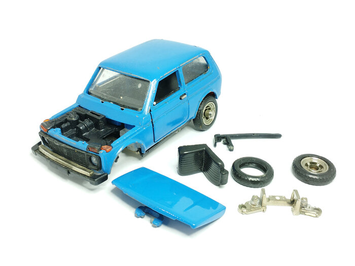 Всем привет! Я продолжаю восстанавливать модели из коллекции моделиста И. Сегодня, дошла очередь до одной из самых сложных и любимых саратовских моделей, за которой многие коллекционеры охотятся до сих пор. Это ВАЗ-2121 "Нива" в масштабе 1: 43 производства Тантал. Модель постномерная. Номер А20 уже отсутствует, однако,Нива" имеет покрытые хромом: дно, ходовую часть, колёсные диски и то, что осталось от поворотного механизма передних колёс, стеклоочистителей и боковых зеркал. Кузов имеет приятный глубокий синий цвет. Мне уже доводилось восстанавливать саратовскую Ниву, но тут, работа будет немного сложнее. Ссылку на предыдущую работу оставлю в конце статьи ⬇️. У модели: ❌ Отсутствуют колёса (2 передних и одно запасное); ❌ Отсутствуют 3 колпака; ❌ Сломаны боковые зеркала и стеклоочистители; ❌ Отсутствуют стёкла на левой и правой дверях; ❌ Отсутствует диван и одно из передних кресел; ❌ Сломан задний бампер; ❌ Отсутствует руль; ❌ Многочисленные сколы краски на кузове; ❌ Отсутствуют элемент