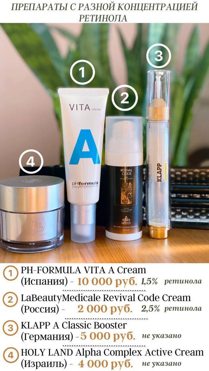 Я решила провести небольшое исследование🔬 Для этого мне понадобились: ▫️профессиональные крема, в составе которых заявлен ретинол или его эфир ▫️лампа Вуда - дерматологический инструмент для диагностики кожных заболеваний. Принцип действия этой лампы — свечение органических следов жизнедеятельности микроорганизмов в ультрафиолетовом свете. 🔍 Любопытно, что лампы Вуда также применяются в криминалистике для обнаружении следов биологических жидкостей. В сельском хозяйстве - для обнаружения заражения растений грибками. В банковском деле - для определения подлинности банкнот. Возвращаемся к исследованию)) Поочередно на зону предплечья я нанесла 4 разных средства. 1. Крем от испанского производителя Ph-formula Vita A. Концентрация ретинола достигает 1,5%. Стоимость: 10 тыс. рублей 2. Крем российского производства LaBeautyMedicale Revival Code Концентрация ретинола 2,5%. Стоимость: 2 тыс. рублей 3. Сыворотка от немецкого производителя Klapp A Classic Booster Концентрация ретинола не указан
