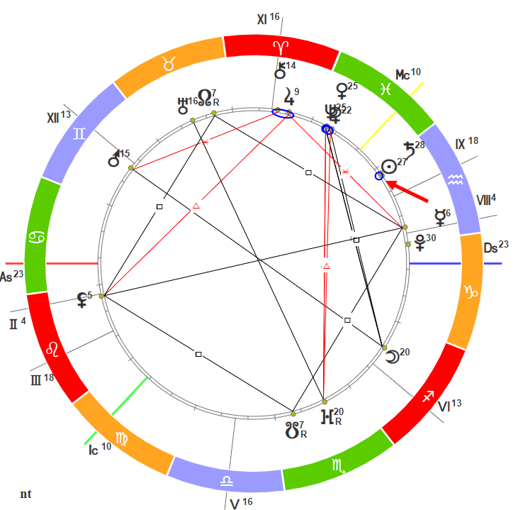 Также линии, обозначающие аспекты помечены соответствующими символами: треугольник — трин, звездочка (*) — секстиль, квадрат — квадратура. Оппозиция представлена просто черной линией. С соединением все более очевидно, но пример отметила стрелочкой на скрине.
