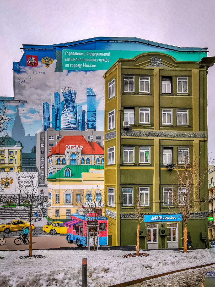 Он настолько гармонично вписался в место, в котором поселился, что не сразу понимаешь, что это. Вот и я чуть не пробежала мимо, но зацепившись боковым зрением, за яркую картинку, в сером феврале, замерла. И было от чего! Это самый огромный мурал в Москве, из тех, что уже были обнаружены мной. Я бы сказала, что это не просто мурал, а целый город, часть города, воссозданная на стене. Его очень любопытно рассматривать. Например, его правая часть так имитирует фасад здания, что обнаружить реальные окна не просто, даже стоя рядом. А человек, рядом со входом в кафе, так и вообще кажется вот вот зайдет. Центральная часть, смесь прошлого и настоящего. Несколько поколений домов, от особняков, до высоток Москвы Сити. Яркие фуд-траки, такси, куда же без них и даже велосипедист-доставщик, мчит на встречу ветру. И пожалуй, самая простая часть, левая, там все лишь имитация фасада и человек проходящий мимо банка. Вот такая случайная и очень классная находка. Что с ней делать, можно просто доеха