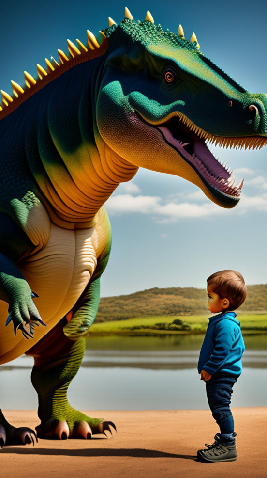 Жил-был динозавр по имени Бруто в далеком лесу. Он был самым большим и сильным динозавром в округе, но был также очень одинок. Однажды, когда он гулял по лесу, он заметил маленького мальчика, который играл рядом со своим домом. Мальчик был очень любопытным и не боялся подойти к Бруто. Сначала Бруто испугался мальчика, но затем он понял, что тот был дружелюбен. Мальчик предложил Бруто поиграть с ним в прятки, и динозавр с радостью согласился. Они провели весь день вместе, и Бруто понял, что впервые не чувствует себя одиноким. Мальчик стал приходить к Бруто каждый день, чтобы играть с ним. Он принес ему ягоды, фрукты и орехи, чтобы показать свою дружескую привязанность. Бруто в свою очередь начал охранять дом мальчика, чтобы защитить его от всех опасностей леса. Вскоре, мальчик стал учить Бруто новым играм, и они проводили время весело и счастливо. Бруто также стал помогать мальчику на ферме, где он жил. Он поднимал большие камни и орал, чтобы отпугнуть диких животных, которые нападали н