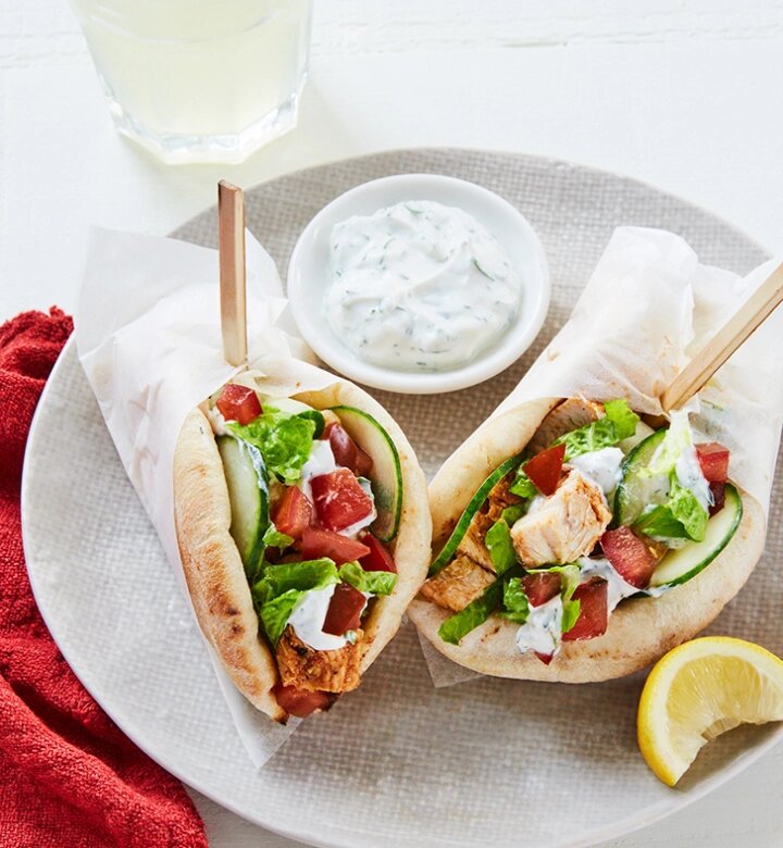 16 мини-лавашей 1. МАРИНОВАНИЕ КУРИЦЫ: Поместите курицу в большой закрывающийся контейнер. В небольшой миске взбейте вместе оливковое масло, лимонную цедру, лимонный сок, сушеный чеснок, кумин, кориандр, паприку и перец. Вылейте маринад в контейнер и хорошо обмажьте курицу. Оставьте курицу мариноваться на 30 минут - 1 час. 2. ПРИГОТОВЛЕНИЕ СОУСА: Пока курица маринуется, смешайте в миске среднего размера греческий йогурт, лимонный сок и чеснок. Добавьте петрушку и укроп, приправьте солью и перцем. Накр
