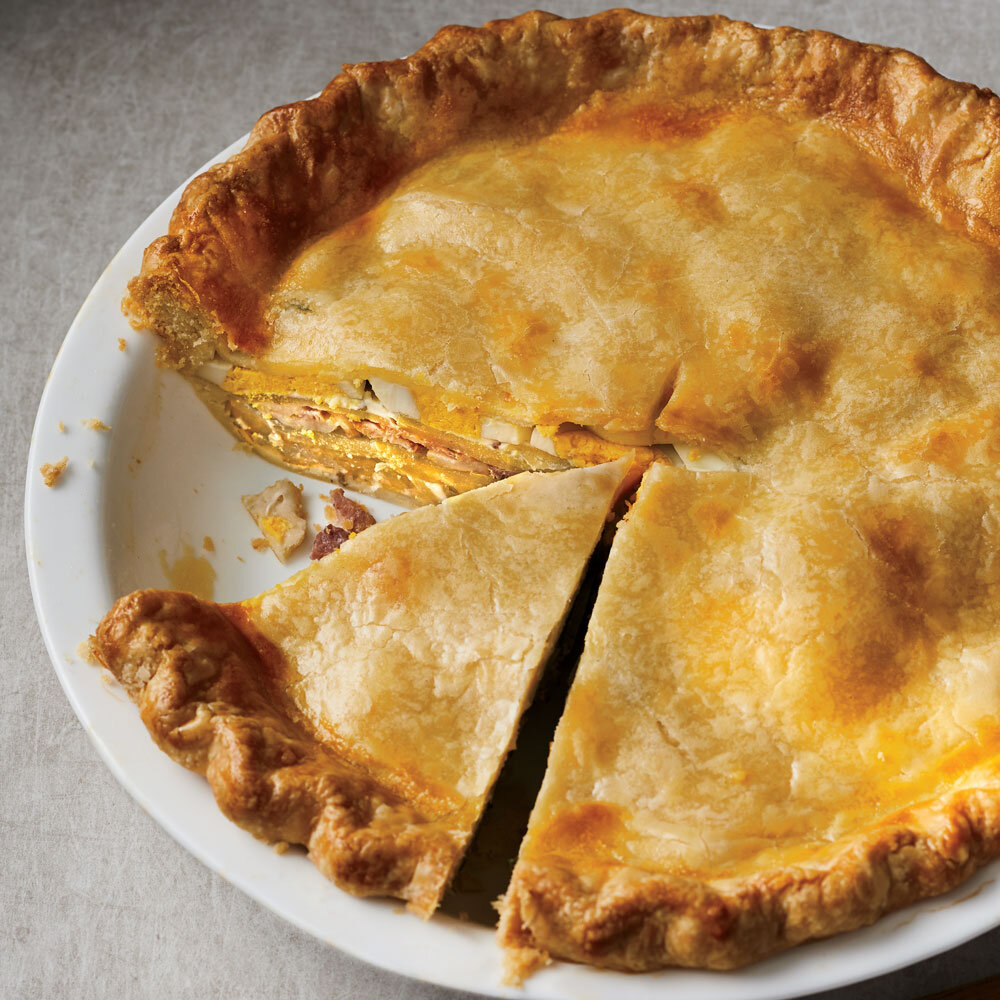 Из этого пирога можно сделать простой, элегантный и сытный обед на выходных в паре с охлажденной бутылкой вина и зеленым салатом. ИНГРЕДИЕНТЫ ПОШАГОВЫЙ РЕЦЕПТ 1. Приготовьте тесто Смешайте муку, масло и 3/4 чайной ложки соли в большой миске. Кончиками пальцев втирайте сливочное масло в мучную смесь, пока смесь не станет похожей на муку грубого помола. Сделайте углубление в центре. Смешайте 1 яичный желток с достаточным количеством ледяной воды, чтобы получилось 1/4 стакана; вылейте в углубление и перемешайте с мучной смесью. Выложите тесто на слегка посыпанную мукой поверхность. Замесите тесто, пока оно не станет однородным. Тесто разделите на 2 половины. Оберните каждую половину полиэтиленовой пленкой и охладите не менее 8 часов или всю ночь. 2. Раскатайте тесто Разогрейте духовку до 200 °C. Разверните одну половину теста и раскатайте её в лепешку диаметром 33 см на слегка присыпанной мукой поверхности; поместите в 23 см форму для пирога. Охладите 10 минут. 3. Замочите ломтики картофе