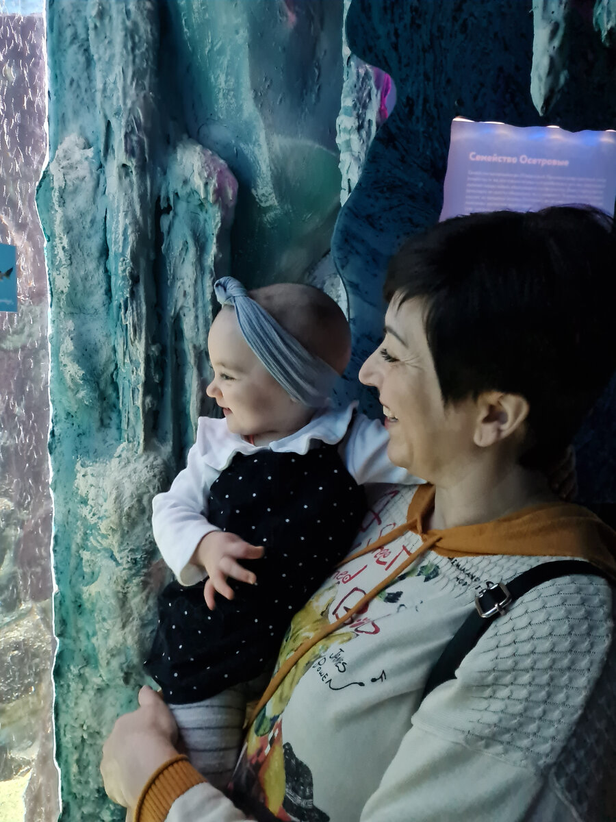Поездка в океанариум в Москве, дочке 1.1. Мне многие говорили, что это бесполезная трата денег, так как ребёнок в год ничего не понимает, а если и понимает то испугается... Ничего подобного! Дочь была безума от всех рыбок. Она с первого оквариума поняла, кто это, и начала показывать рыбок (она губами "чпокает", когда просишь показать рыбку). На фото видно её безумно радостные глаза! Это она с бабушкой со стороны папы. Ей хотелось потрогать всех рыбок. У каждого аквариума мы могли простоять по 15 минут... еле ушли от больших рыбок... дочь даже заплакала! Я ещё добавлю, что ребёнок у меня совершенно боязливый. Она совсем не смелая... Своих дедов до сих пор боится... как и всех мужчин в общем. Так что если у вас есть желание, то смело идите и развивайте своего ребёнка! После таких эмоциональных поездок у ребёнка происходит новый скачет развития, появляются умелки. И как кирпичей ложится в его кругозор и будущее стремление познавать и исследовать мир.