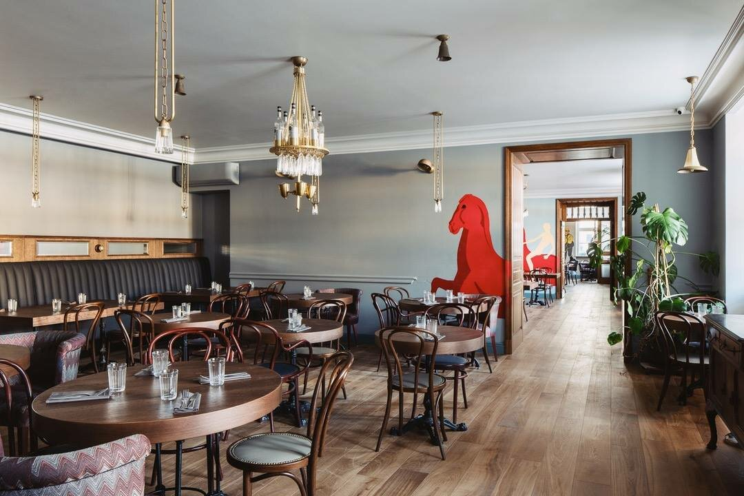 Сегодня мы поговорим про заведение, которое было не раз номинировано и получало награды ведущих ресторанных премий Санкт-Петербурга🏅. Petrov-Vodkin - это ресторан, где традиционные советские блюда получают новую, современную жизнь. Оценка на ЯндексКартах 4.7, средний чек на персону 1400-1600 руб. Я наткнулся на данное заведение прогуливаясь в районе Дворцовой площади. Привлекло мое внимание интересное название в честь российского живописца Кузьмы Сергеевича Петрова-Водкина. Внутренний интерьер, выполненный с использованием приглушенных оттенков, классической мебели и различных антикварных предметов, передает атмосферу заведения конца ХIX–начала XX века. На помощь также приходит музыкальное сопровождение, состоящее из русских народных песен и романсов, которые дополняют общую картину. Стены украшают персонажи картин самого Петрова-Водкина, которые так искусно "сплелись" с "советским" интерьером. Роспись на стенах выполнена в технике граффити. Переходя к ме