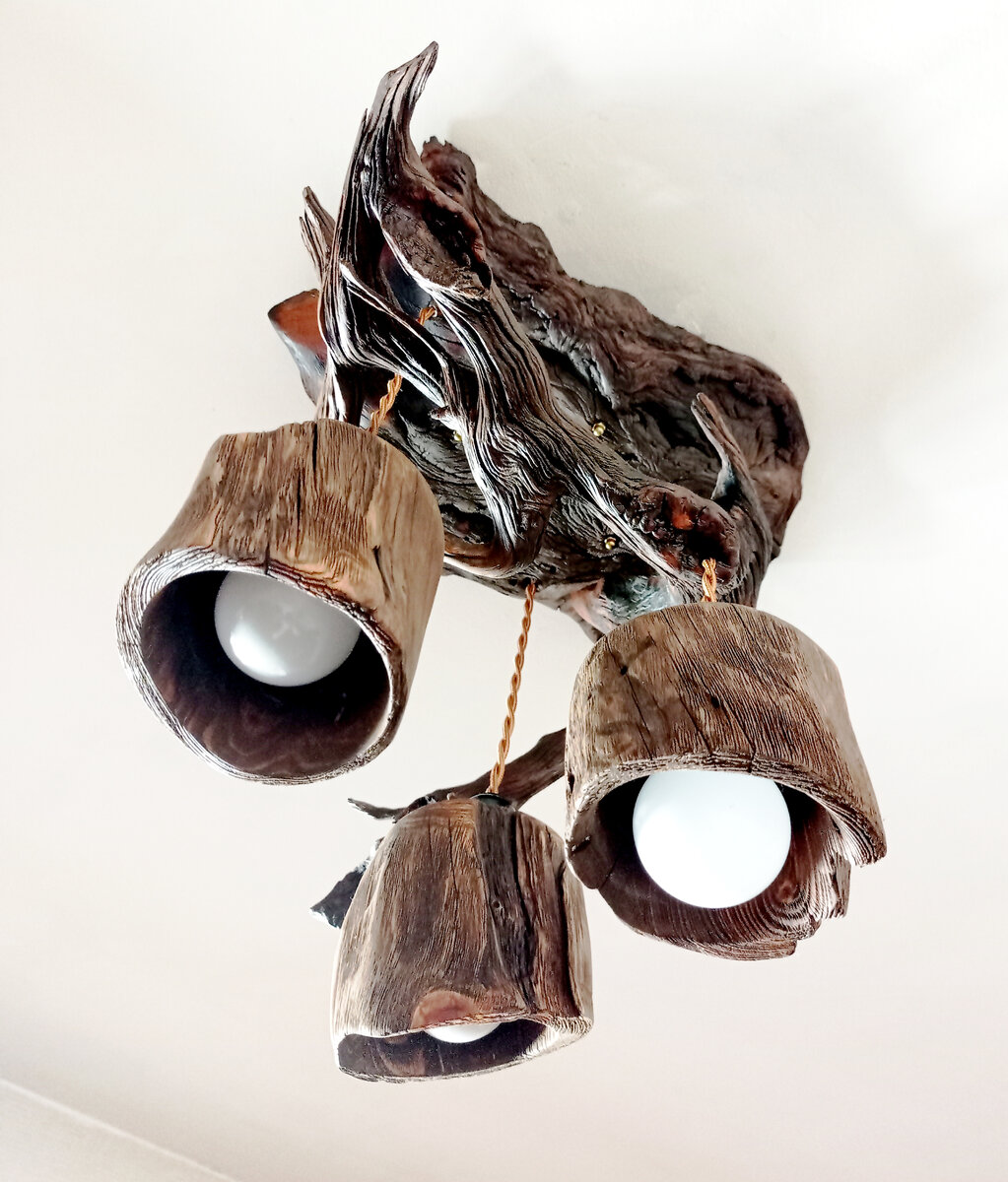 Очередная реализованная идея люстры жила в моей голове давно. Немало находок могло быть основой люстры, но выбор пал на витиеватый корень лиственницы который и послужил основой. К нему сразу нашлась подошва - обгорелый кусок ствола с природной брашировкой все той же горной лиственницы. А вот с плафонами вышла неувязочка- их не было. Это то и тормозило весь процесс. Идея оформилась неожиданно! При точении вазы с живым краем и стенками её форма напомнила мне плафон. Так как ствол сосны из которого была вырезана заготовка,оказался достаточно объемный, из него вышло еще два плафона и одна вазочка (но это так, побочный проектик...) Немного техники, шурупов и мастерства и основа-каркас уже лежал на верстаке в сборе. Отверстия под патрон сделал коронкой . в донышках и боковых стенках было множество отверстий от короеда - это нужная лампе вентиляция. Все изделие получилось с естественной брашировкой. Родной цвет мореной лиственницы усилил темным маслом под дуб. Декоративный скрученный прово