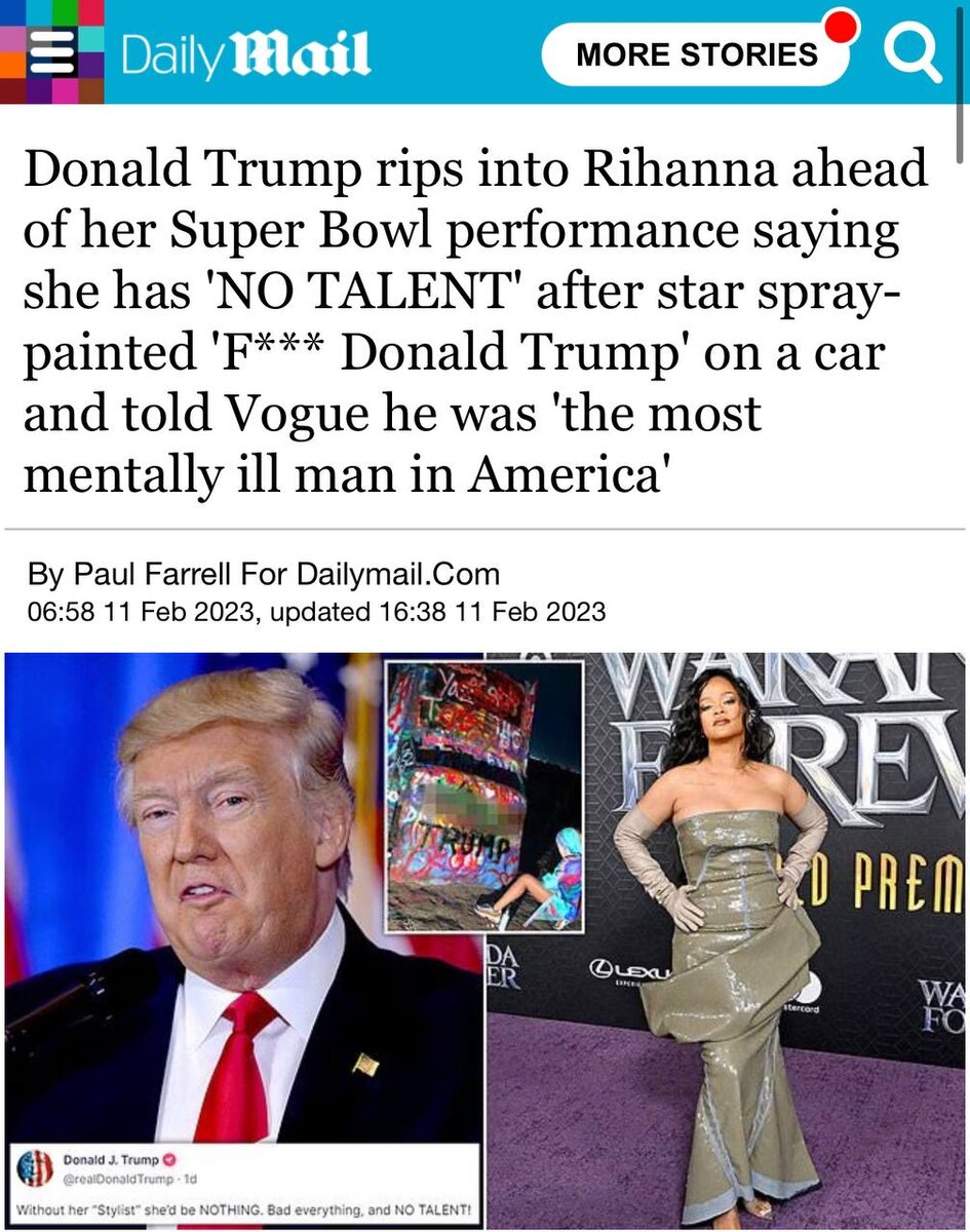 Бывший президент США высказался о предстоящем шоу Рианны на супер-кубке. В одной из соцсетей он написал: «Без ее «Стилиста» она была бы НИЧЕМ. Плохо всё, и НЕТ ТАЛАНТА!». Надо сказать, что ненависть у них взаимная. Пару лет назад в интервью Vogue Рианна назвала Трампа «самым психически больным человеком в Америке» и запретила его штабу включать свои песни на встречах с избирателями.