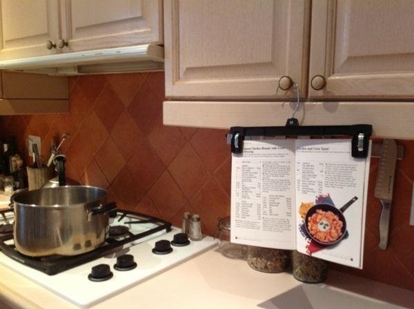 Используя вешалку для брюк, вы можете подпереть книгу рецептов для удобного чтения во время работы на кухне. Вешалка позволит вам просто повесить рецепт в любом месте, где вы работаете, тем самым оставив руки свободными, чтобы сосредоточиться на приготовлении блюда. Кто сказал, что готовить трудно?