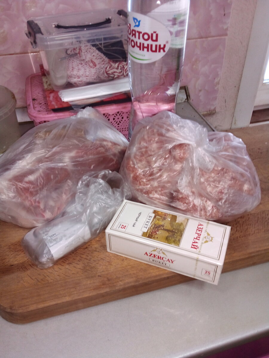 Всем привет, мои дорогие подписчики и гости моего канала. День сегодня начался с очистки снега. Потом завтрак. Сходили в магазин купили фарш и грудинку Чая, минералки и таблетки от давления, еще взяли кг гвоздей и уголки. Из фарша решила сделать колбаски. Делала я это в первые. Решила сделать 2 вида колбасок. Фарш перемешивала в планитарном миксере со специями и добовляла ледяной воды. Потом взяла мясорубку с насадкой для колбасок. Натянула кишку для колбасок и стала набивать. Потом перекрутила и вот что у меня получилось Грудинку замариновала для бекона, а из одного кусочка грудинки решила зделать рулет и его разрезала по кругу Немного надрезала чтоб специи и соль хорошо промариновали грудинку. Намешала соль повариную и нитратную довалила паприку и смесь трав и эти натерло мясо Со всех сторон и скрутила кусок И все убрала в пакет и поставила в холодильник мариноваться от 4 до 5 дней. Что получиться покажу позже. А вот что получилось из колбасок Вот так я провожу выходные, мн