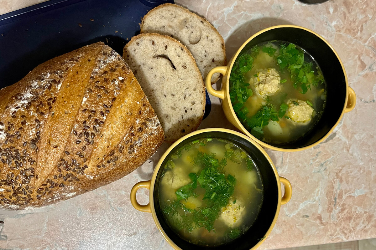 Сегодня мы приготовим Суп с фрикадельками. Ингредиенты: -Куриный фарш (400 грамм) -Яйцо (1 шт.) -Картофель (3 шт.) -Морковь (1 шт.) -Лук (2 шт.) -Зелень -Соль (по вкусу) -Рис (3 ст. л.) -Специи: Куркума, Хмели Сунели, Черный перец, Красный перец, Чеснок Ну что, Начнем! ! Первым делом поставьте воду в кастрюле на огонь, чтобы когда подготовим фрикадельки она уже была кипяченая. 1. В куриный фарш добавляем соль, перец, чеснок по вкусу. Размешиваем. Далее добавляем натертый на терке лук и один желток Тщательно перемешиваем и ЧУДЕСА! Наш фарш готов)) 2. Формируем , как шарики фрикадельки Фрикадельки перекладываем в уже кипяченую, подсоленную и заправленную специями (куркума, хмели сунули, красный перец) воду и оставляем на 10-15 минут под закрытой крышкой. 3. Нарезаем картофель и лук кубиками, морковь трем на терке. 4. Картошку добавляем к фрикаделькам, а лук и морковь отправляем тушиться на сковородку , до прозрачности лука. 5. Добавляем зажарку и рис в суп. 10-15 минут томим суп под кры