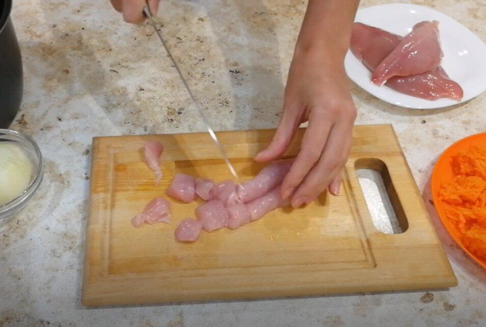 Доброго времени суток! Одним из моих любимых рецептов на скорую руку является плов. Особенно, если его готовить в мультиварке-скороварке. Но если такой техники нет, то можно обойтись классической сковородой. Разница в том, что придется периодически подходить к плите, чтобы следить за рисом. С мультиваркой же: все нарезал, закинул в чашу и пошел отдыхать... или заниматься другими делами по дому. Перейдем к самому рецепту плова. Сначала необходимо нарезать филе индейки на кубики. Затем отправляем в чашу мультиварки, в которую я растительное масло не добавляю. Репчатый лук нарезаем полукольцами. Рис берем либо для плова, либо обычный. У меня в этот раз был дома только круглозерный, без пометки "для плова". Вообще все эти пометки порой являются типичным маркетинговым ходом. Рис очень хорошо промываем, чтобы вода стала прозрачной. Также натираем морковь. И все ингредиенты отправляем в чашу мультиварки. Затем заливаем двумя стаканами воды, чтобы она покрывала рис на 0,5 см вверх. Перемешивае