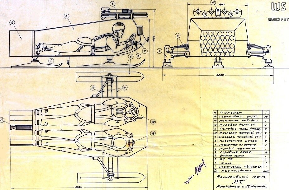 Оригинальный проект в июле 1942 года представили в ГАБТУ военинженер 3-го ранга Н.М. Мадатов и старший техник-лейтенант Д.Н. Рутковский, служившие, как ни странно, в ВВС Тихоокеанского флота. Они предложили «Реактивный танк РТ», в конструкции которого явно прослеживались «авиационные» ноты. Реактивный танк представлял собой металлический бронированный короб обтекаемой формы, поставленный на колёсный ход и оснащённый реактивным двигателем. Зимой предполагалось заменять колеса лыжами. Кабина была рассчитана на двух человек – водителя и стрелка. Экипаж располагался внутри лёжа и пристёгивался к ложементу ремнями. Вооружением РТ были шесть направляющих с реактивными снарядами РС-82, сгруппированных в две батареи, между которыми устанавливался авиационный пулемёт ШКАС. Оружие размещалось в башне, наводящейся по вертикали и горизонтали. Стрельба могла вестись как на ходу, так и с места, запуск РС – как залпом, так и одиночно. «Реактивный танк РТ» конструкции Н.М. Мадатова и Д.Н. Рутковского