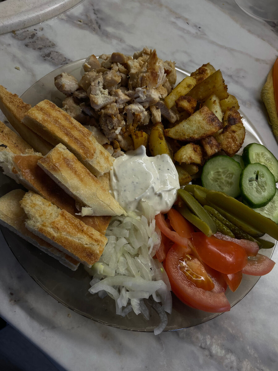 Для приготовления нам понадобится: -Куриное мясо,у меня грудка -Картофель -Овощи(какие вашей душе угодны) -Лук -Лаваш Для маринада курицы: -Майонез 1сл.л -Горчица 1ст.л -Сметана 1ст.л Соус для шаурмы: -Сметана -Майонез -Сухой или свежий чеснок -Приправа для курицы -Паприка копченая И так погнали. Курицу режем большими кусками,складываем в миску и маринуем. Пока маринуется курочка мы замаринуем лук,на одну большую луковицу я беру 2 чайные ложки уксуса и 1,5-2ложки сахара(сахар собьёт горечь).Режем лук полукольцами, кладём в миску,заливаем уксусом и сахаром,тщательно мнем чтоб лук дал сок, накрываем крышкой и оставляем мариноваться. Тем временем берем картофель, моем его тщательно и в кажуре кладем его в пакет,завязываем и убираем в микроволновку на10-15минут в зависимости от размера картошки.Благодаря этому картофель будет полу готовый и в дальнейшим мы его не пересушим в духовке.Пока наша картошка в микроволновке мы займемся курицей.На разогретую сковородку вливаем масло, выкладываем