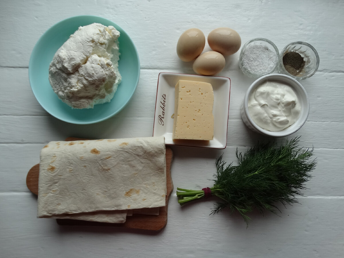Делается это чудо так быстро, что не передать. Конечно, при желании можно усложнить любой процесс. Но я не сторонник сложностей, мне нравится, когда я готовлю вкусно и шустро. Весь секрет этого рваного пирога из лаваша в том, чтобы начинка была и не густой, и не плотной. Я готовлю ее из творога, но можно творог заменить на картофельное пюре, тушенную капусту (кстати, это – отдельный рецепт, и очень любопытный; возможно, я вас с ним познакомлю), фарш или овощи. Правда, из всего этого получатся исключительно закусочные пироги, и только один творог позволяет сделать десертное блюдо. Ингредиенты: · Лаваш (у меня большой, на 240гр) – 1шт.; · Творог – 350-400гр; · Яйца – 3шт.; · Сыр твердый – 150гр; · Сметана жирная – 2/3ст.; · Зелень (укроп и/или петрушка) – пучок; · Соль, перец. Приготовление: 1) В миске смешиваем яйца и сметану. Смесь солим и перчим. Мне нравится в этом пироге яркий вкус, поэтому я не скуплюсь на специи, и сразу ввожу 0,5 чайной ложки соли и целую ложку перца. Но это уже