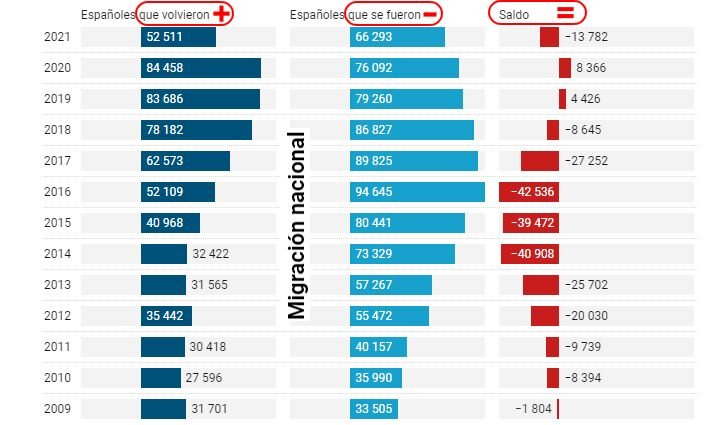 Эмиграция из Испании. Вопреки усилиям правительства, «утечка способностей» или «el talento fugado» (не путать с явлением «утечка мозгов» — «fuga de cerebro») из Испании увеличилась: за 3 года числа покинувших родину испанцев увеличилось на 7%. Работа, которую можно найти в Испании, очень часто не соответствует высокому уровню квалификации специалистов По состоянию на 1 января 2021 года, согласно данным INE, испанское население, проживающее за границей, составляло 2 654 72 человека большинство из которых распределено между американским контентом и Европой. Правительство приступило к реализации «Плана возвращения в Испанию» в июле 2019 года. Кампания продлилась до 2020 года. Итог: только 30% из тех, к то стал участником программы, финансируемой государством, вернувшись на родину и пожив в Испании, решили остаться в стране навсегда. 70% вернулись за кордон. Нерея Парро, эмигрировавшая в Швейцарию, критикует внушение испанцам с детства идеи об успешной учёбе как залоге успешного трудоустр