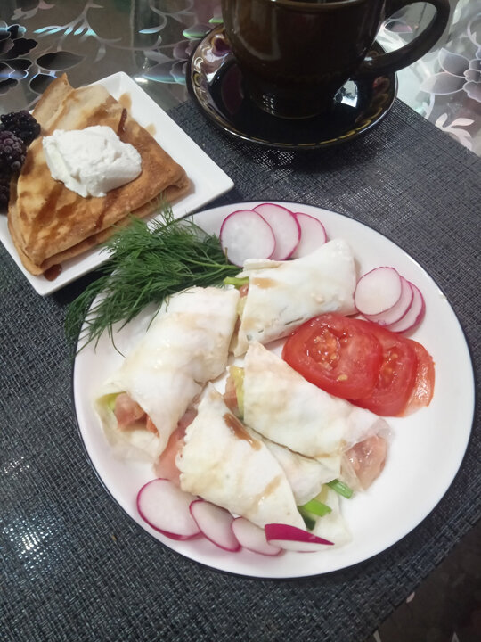 Сегодня на завтрак одни «вкусняшки»! Два блинчика - из одних яичных белков, приготовленных на антипригарной сковороде без масла. А в них завернула кусочек слабосоленого кижуча собственного посола (рецепт - в комментарии к статье), брусочек свежего огурца, перо зелёного лука и веточку укропа. Нарезала помидорчик и редиску, вот хочу ее всю зиму! Из остававшейся сыворотки решила испечь блинчики из овсяной и полбяной муки. Это было исключение из правил. Обычно пеку из муки ореховых - миндальная, кокосовая, и ещё льняная для меня в приоритете. На два стакана сыворотки добавила на глаз муки, 1 яйцо, соль и 1 ст.л. растительного масла, хорошо всё размешала и выпекала на большой сковороде-блиннице с низкими краями без масла. Как ни странно, первый блин получился не комом, легко перевернулся и не порвался, хорошо подрумянился. «Мучные» блины пекла для мужа, получилось 7 штук, но один решила оставить себе - для эксперимента. Чай заварила зелёный с лепестками роз - летом собирала и сушила лепестк