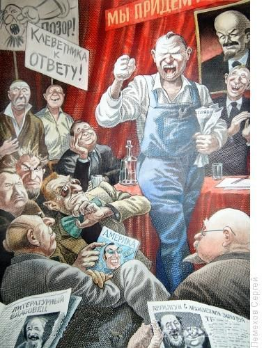 Так современный художник увидел собрание в СССР, обсуждающее высылку из страны А. И. Солженицына. Однако некоторых реалий того времени он не учёл или не знает: например, в советских газетах тех лет могли появиться (и появлялись) карикатуры на Солженицына и статьи об этом событии, но никак не фотографии лица, высланного за границу. А выпускаемый властями США журнал "Америка", хоть он и продавался свободно в киосках "Союзпечати", вряд ли кто-то стал бы демонстративно читать именно на таком собрании