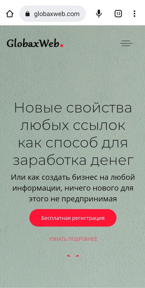 Сегодня мы поговорим о посещаемости своего сайта, страницы в соцсетят и т.д. , т.е. о том ресурсе, где Вы продаете свой товар, предлагаете услугу, короче, Ваш хлеб🍔. Как увеличить число посетителей Вашего ресурса, соответственно увеличить продажи 💲. Теперь с технологией GlobaxWeb это просто. https://globax.top/221572 переходим по ссылке, попадаем на сайт GlobaxWeb Регистрируемся, указав почту и задаем пароль. Подтверждаем почту, все предельно просто, если Вы владеете элементарными навыками ПК, а Вы точно владеете, раз продаете в Интеренет на своем ресурсе. Дальше попадаем в свой личный кабинет Дальше нажимаем три полосочки в правом верхнем углу, заходим во вкладку "сокращенние ссылки" Попадаем в такое окошко: Находим на Ютубе, любых социальных сетях, где угодно видео с большим количеством просмотров, это гарантия того, что видео посмотрят и поделятся с ним с другими. Это Ваше то, самое "сарафанное радио", благодаря которому к Вам приходят клиенты. Каким образом? Сейчас все пойме